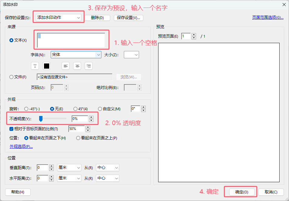 2.b 设置水印为一个空格、0%透明度,保存一个预设名字,确定。